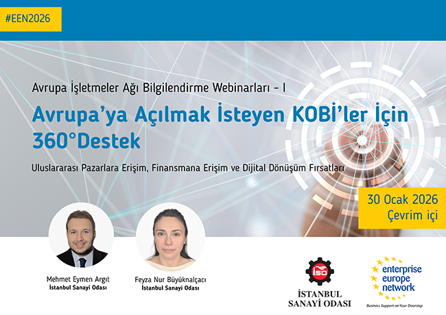 OnlineAvrupa İşletmeler Ağı İstanbul Tanıtım Webinarı- I Uluslararasılaşma, Finansmana Erişim ve Dijitalleşme Hizmetleri Avrupa Komisyonu tarafından Tek Pazar Programı kapsamında desteklenen Avrupa İşletmeler Ağı (Enterprise Europe Network - EEN), KOBİ'ler ve sanayi kuruluşlarının uluslararası pazarlarda rekabet gücünü artırmayı hedefleyen Avrupa çapında bir iş birliği ağıdır. İstanbul Sanayi Odası, 2008 yılından bu yana bu ağın aktif […]